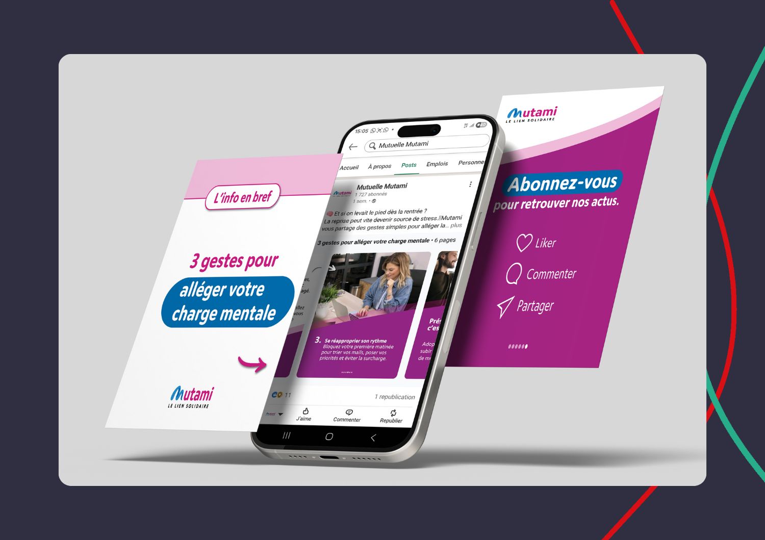 Mutami place la prévention et l’accompagnement au cœur de sa mission. Grâce à cette nouvelle identité visuelle, chaque publication illustre concrètement leur rôle d’acteur de santé solidaire.